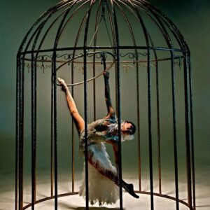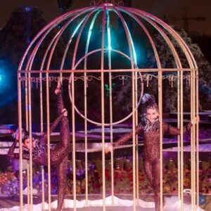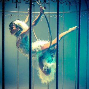 An overhead acrobatic performance using a “cage” pillar. A very tender show on the limits of possibilities!