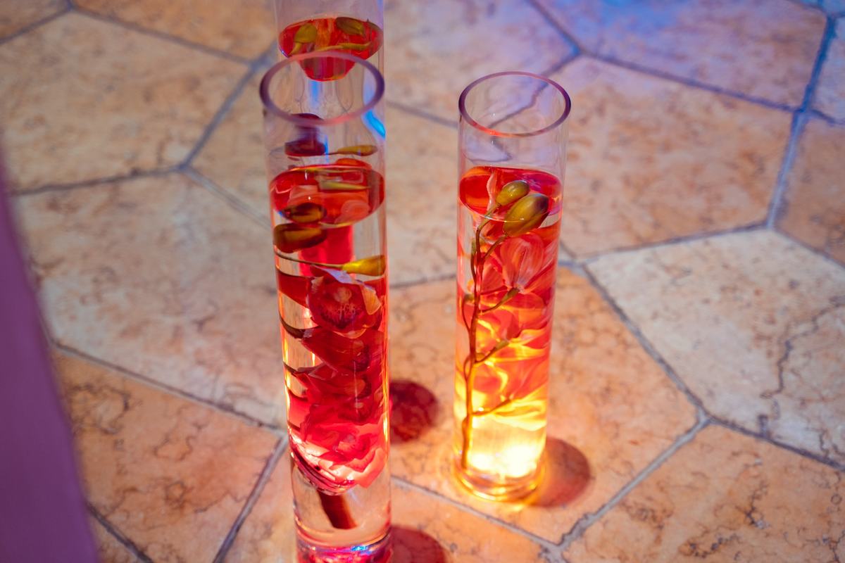 To make the ballroom and outdoor territory look elegant, each cocktail table was decorated with flowers. An exquisite orchid capsuled in a cylinder glass vase added to a pleasantly calm atmosphere of the night.