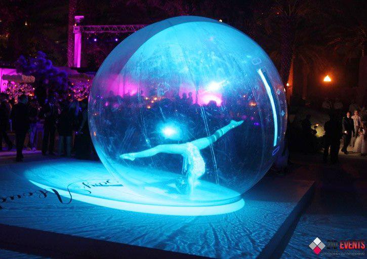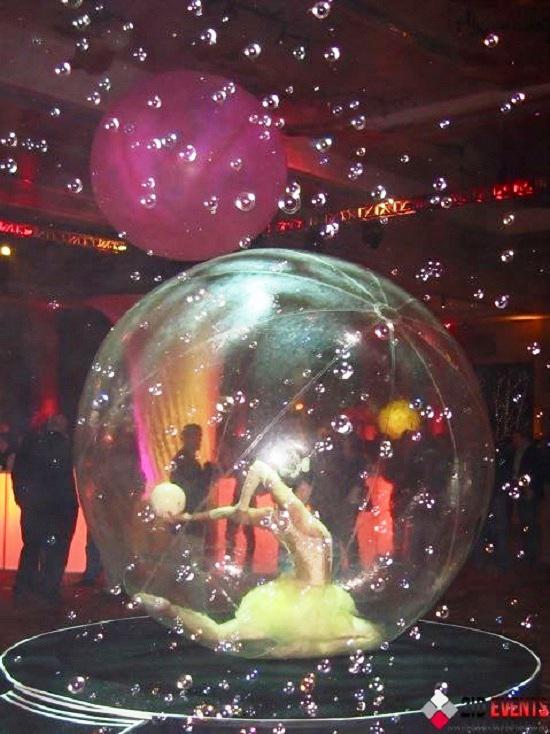 Acrobat in the bubble is an unforgettable visual event where the poetic dance and surprising dynamics of the globe dancer's act gives you strong and joyful sensations. In a visually strong performance the bubble is moved around the floor area, as the artist inside delicately displays her acrobatic skills. The bubble can also be used on water to create a dramatically unique show. Acrobat in the bubble is astonishing and unusual event and will surely amaze your guests, and leave them with a lasting impression. The performers present different acts with the bubbles and can create unique shows specially tailored to your desire and needs!
