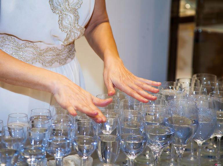 Changing a set of stemmed wine glasses into a wonderful musical instrument, our Harp Player delicately harmonizes each glass by adding an exact amount of water. Then by using only the tips of her fingers, she moves expertly from one glass to another producing various sounds.
