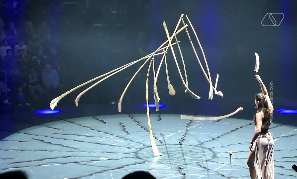 With thirteen palm leaf ribs, the artist creates an oasis of concentration and serenity, a place of equilibrium; fragile moments of joy that, barely created, are destroyed by the artist herself. A performance for the stage, gala dinners, private events, vaudeville, cabarets, museums and many other unusual places.