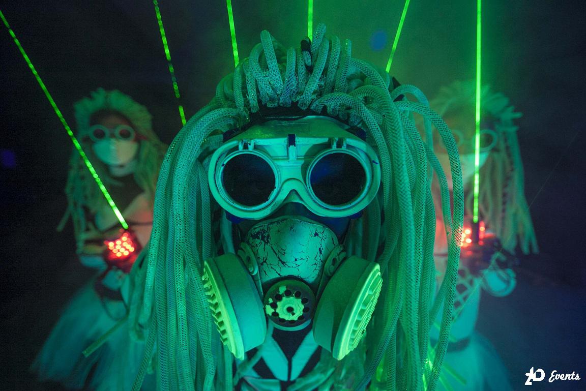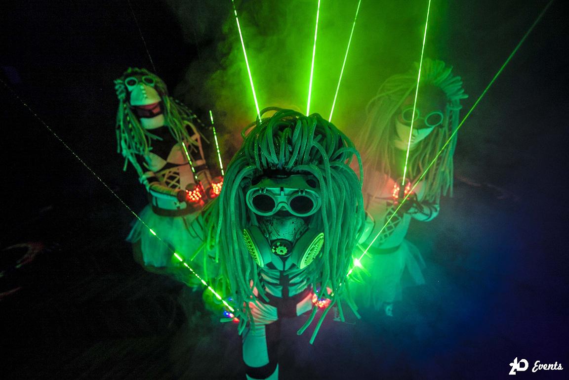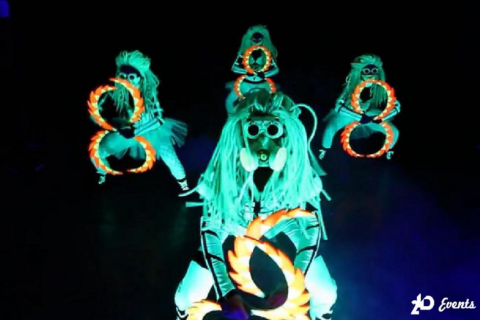 2ID-Events presents captivating and really extraordinary Toxic Performance. It is a terrific compound of unusual costumes of artists, rhythmic and dynamic music and a spectacular choreography with neon props. The audience may seem that it is transferred to another planet with the mysterious creatures that will amaze them by their skills. This show looks very impressive in a completely darkened room. Neon and glow in the dark props really harmonize this performance.