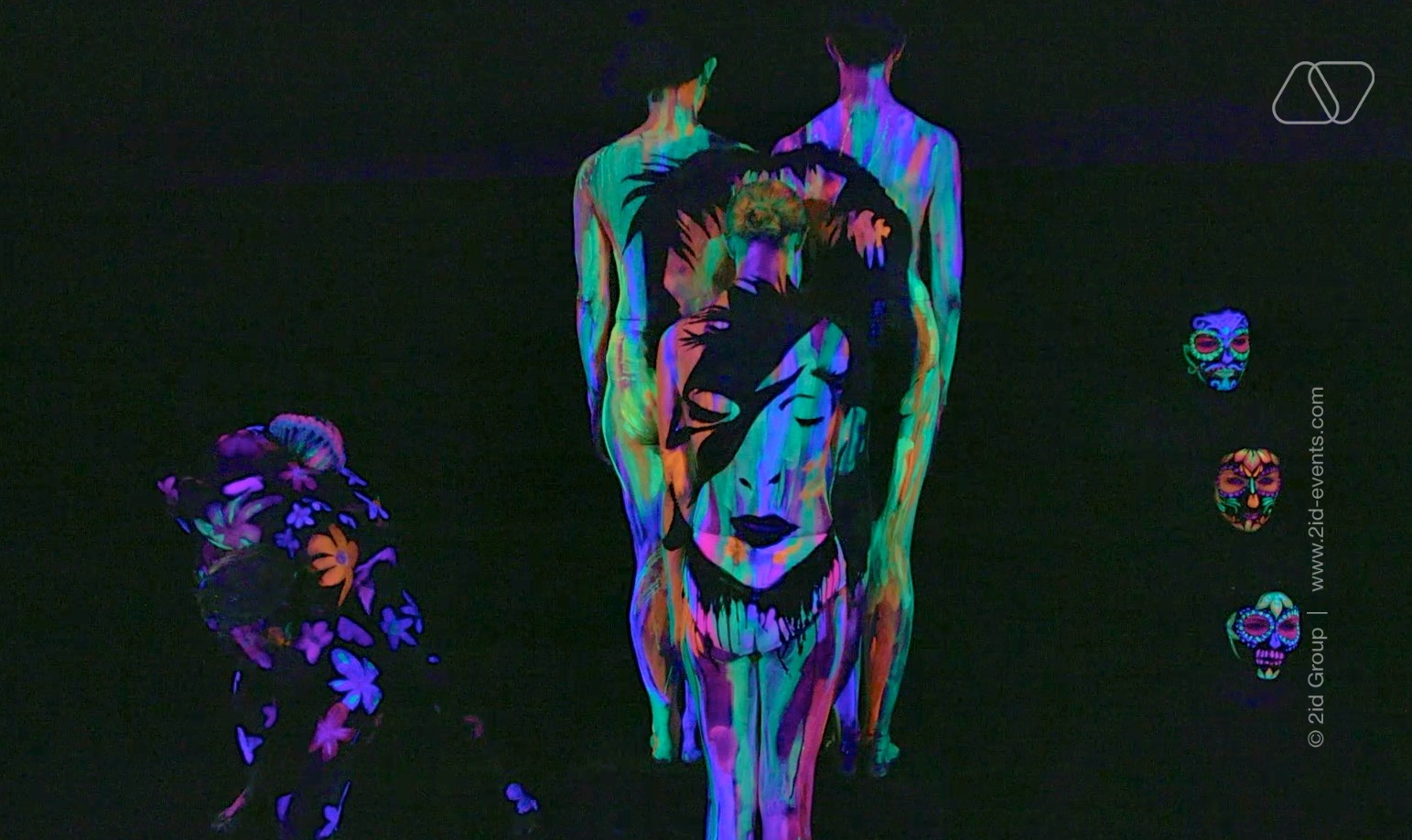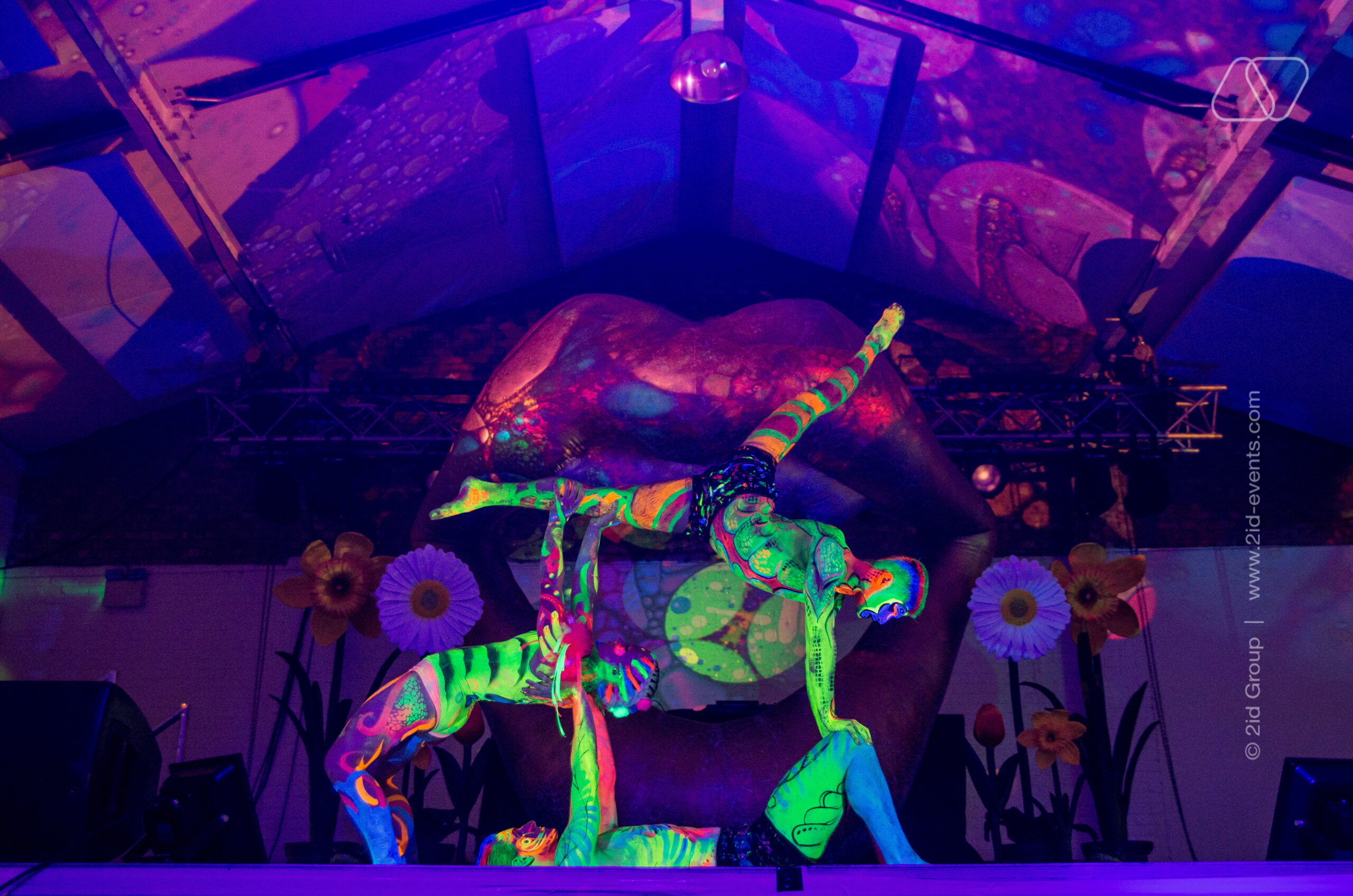 You will be engaged in the fascinating UV dance show with all fairy-tale colors you can even imagine. With the help of UV stunning body art, the artists are floating over the air. You can customize this amazing performance to your event or take a journey to an unbelievable UV planet with incredible creatures.