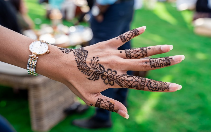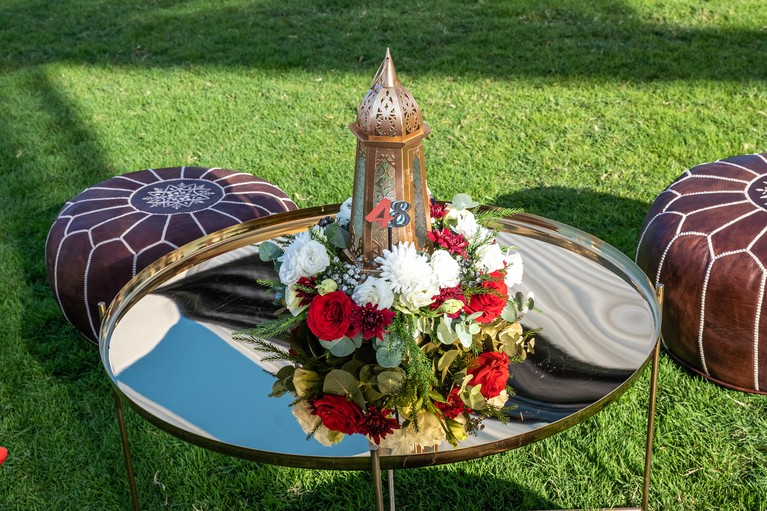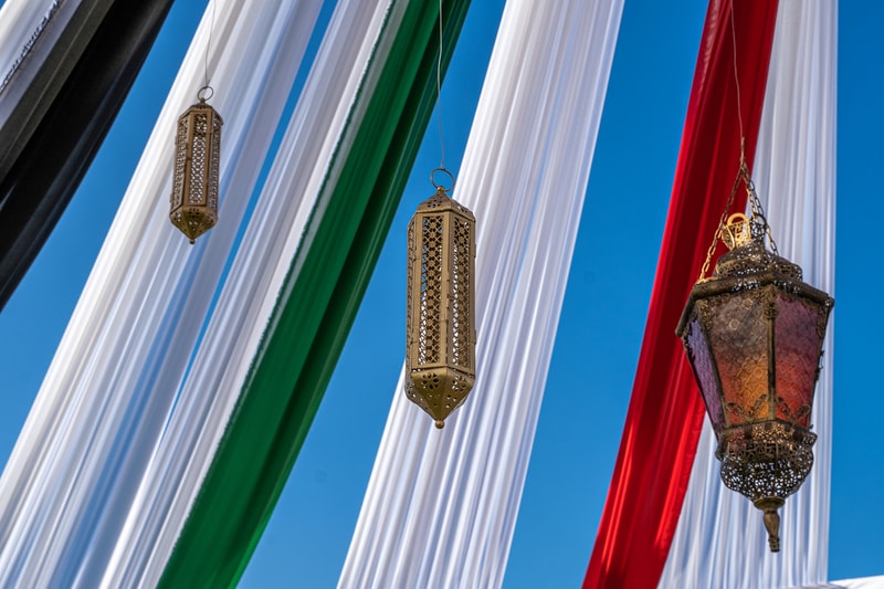 The objective was to preserve traditional elements of the Arabic culture. The celebration took place on Flag Island, a beautiful place in Sharjah with palm trees and green grass. We wanted to keep the atmosphere light and enhance it with elegant decorations. That is when our executive director, Alia Shchiglo, came up with the concept: a combination of classic Arabic themes and sleek modern details. Although standard ceremonies include a covered tent, 2ID EVENTS decided to go in another direction. For a National Day, the idea was for the guests to feel freedom and freshness in the air. A huge open tent with intertwining baldachins of UAE national colours was an unexpected, but elegant solution.